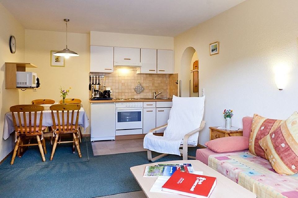 Wohn-/Esszimmer mit Küchenzeile: Komplett eingerichtete Küche: 4-Plattenherd, Backofen, Filterkaffeemaschine, Wasserkocher, Toaster, Mikrowelle, Mixe,Esstisch und 4 Stühle, Sofa, Wohnzimmertisch, SAT-TV, Radio mit CD-Player.