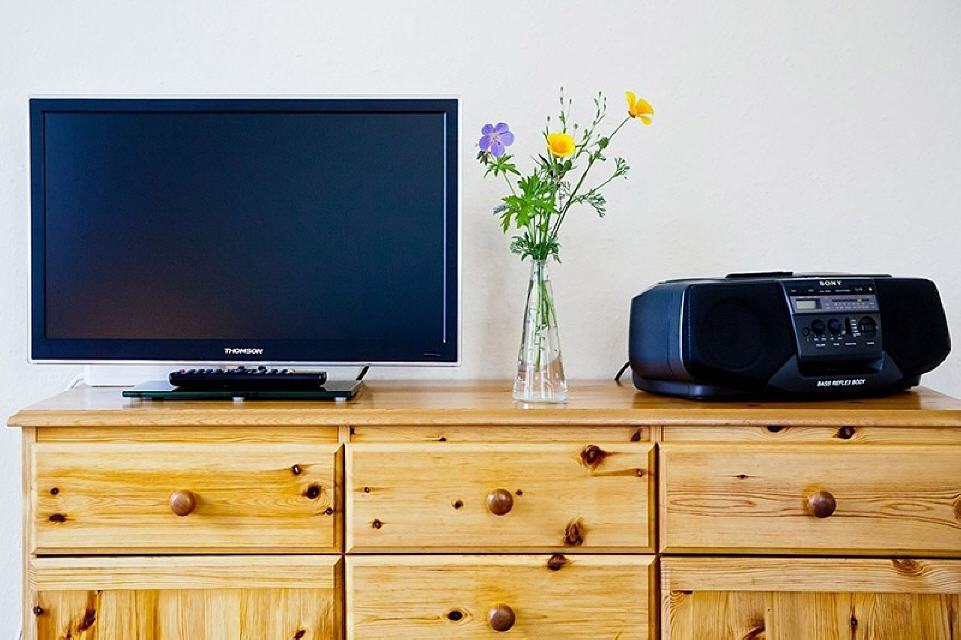 Wohn-/Esszimmer mit Küchenzeile: Komplett eingerichtete Küche: 4-Plattenherd, Backofen, Filterkaffeemaschine, Wasserkocher, Toaster, Mikrowelle, Mixer… Esstisch mit Besteckschublade und 4 Stühlen, Sofa, Wohnzimmertisch, SAT-TV, Radio mit CD-Player.