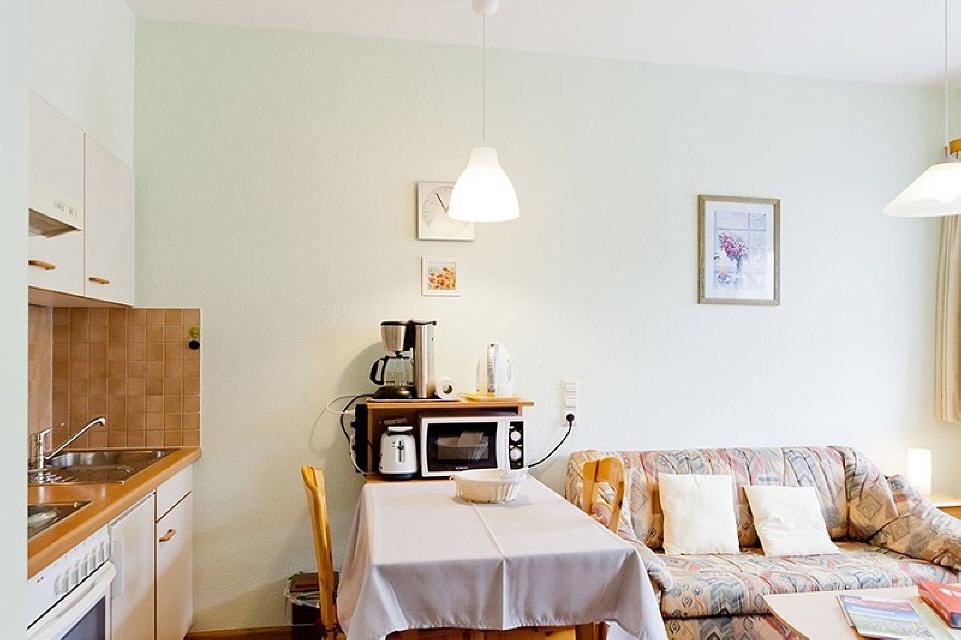 Wohn-/Esszimmer mit Küchenzeile: Komplett eingerichtete Küche: 4-Plattenherd, Backofen, Filterkaffeemaschine, Wasserkocher, Toaster, Mikrowelle, Mixer, Esstisch mit Besteckschublade und 4 Stühlen sowie Sofa, Wohnzimmertisch, SAT-TV, Radio mit CD-Player.