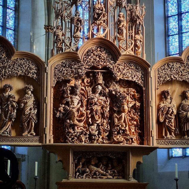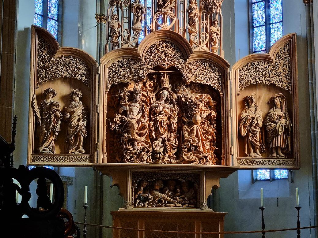 Der Hochaltar des Breisacher Münsters ist ein offenes Altarretabel aus Lindenholz. Es besteht aus zwei gewaltigen Flügeln, einer Predella und einem aufstrebenden Gesprenge. Den Hochaltar schnitzte in den Jahren 1523 bis 1526 ein Meister, der das Monogramm HL (→ Meister HL) hinterließ. Diese Initialen könnten dem Bildhauer Hans Loy zugeordnet werden, der in den Jahren 1519/20 in der Freiburger Malerzunft genannt wurde. Allerdings ist über Hans Loy fast nichts bekannt. Nach einer örtlichen Legende stehen die Initialen für einen Künstler namens Hans Liefrink. Der Altar ist dreimal mit dem Meistermonogramm HL in Form von Täfelchen signiert und zwar jeweils an den Füßen von Maria, Christus und Gottvater. Auf einem Gebetbuch, das ein Engel an der Seite der Gottvaterfigur rechts am Altarrand emporhält, ist mit Infrarotlicht die Jahreszahl 1526 – das Jahr der Vollendung – zu erkennen. Der Hochaltar überstand sowohl die Zeit der Bilderstürme als auch die Zerstörungen des Zweiten Weltkrieges; mit seinen Figuren wurde er in den Bergungsraum des Erzbischöflichen Ordinariats in Freiburg in Sicherheit gebracht. 1941/42 wurde bei Restaurierungsarbeiten die 100 Jahre zuvor aufgetragene Farbschicht abgenommen und der ursprüngliche Lindenton wiederhergestellt. Nur die Inkarnatsteile erhielten eine leichte farbliche Fassung. 1949 wurde der Altar ins Breisacher Münster zurückgebracht.