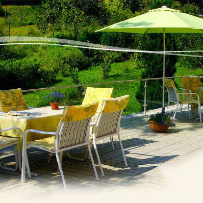 Der Garten mit großer Liegewiese bietet sowohl schattige als auch sonnige Plätze zum relaxen. Die große Terrasse an der Südseite ist ein besonderer Blickfang des Hauses. Schon am Morgen kann man sich im Garten auf der Frühstücksterrasse sein Frühstück vom Buffet schmecken lassen.