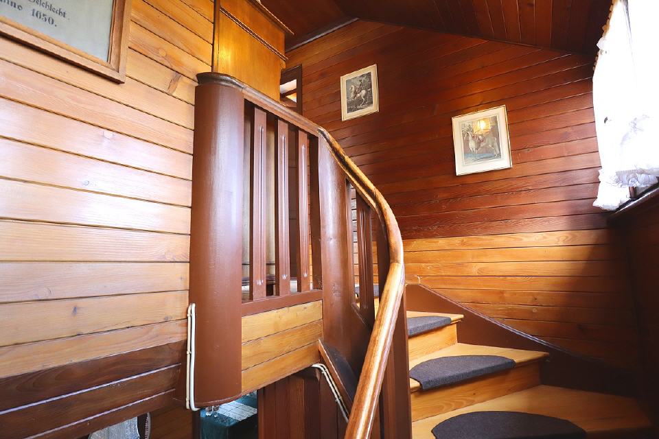 - Über eine breite, geschwungene Holztreppe gelangt man in den oberen Wohnbereich mit 1 Flur und 2 Schlafzimmer sowie modernem Badezimmer