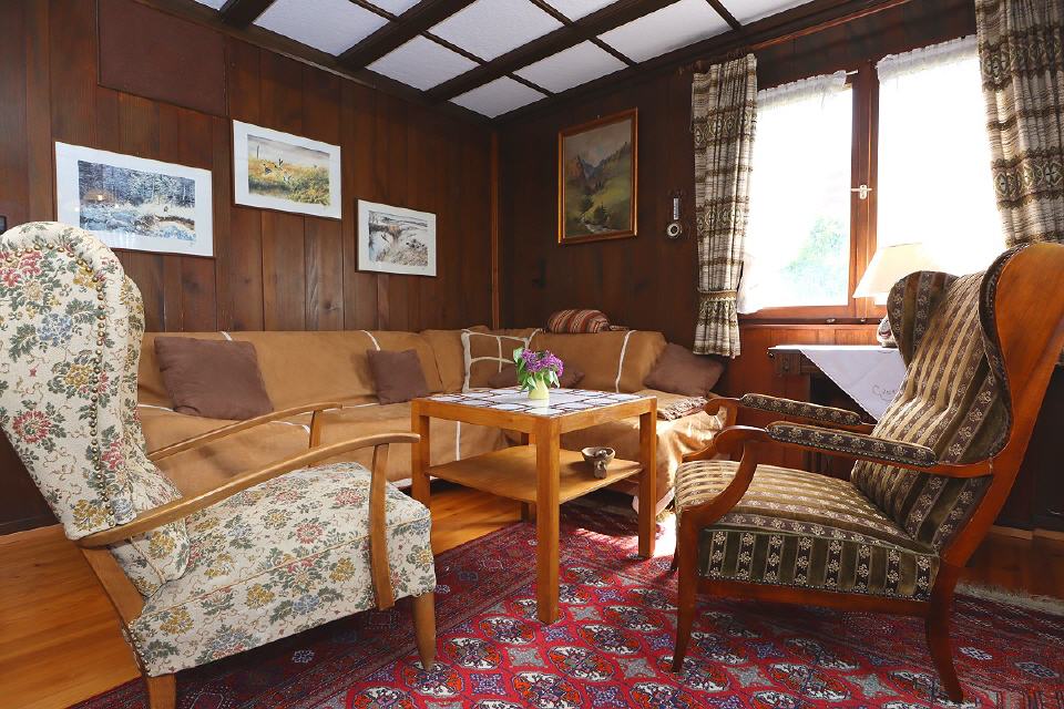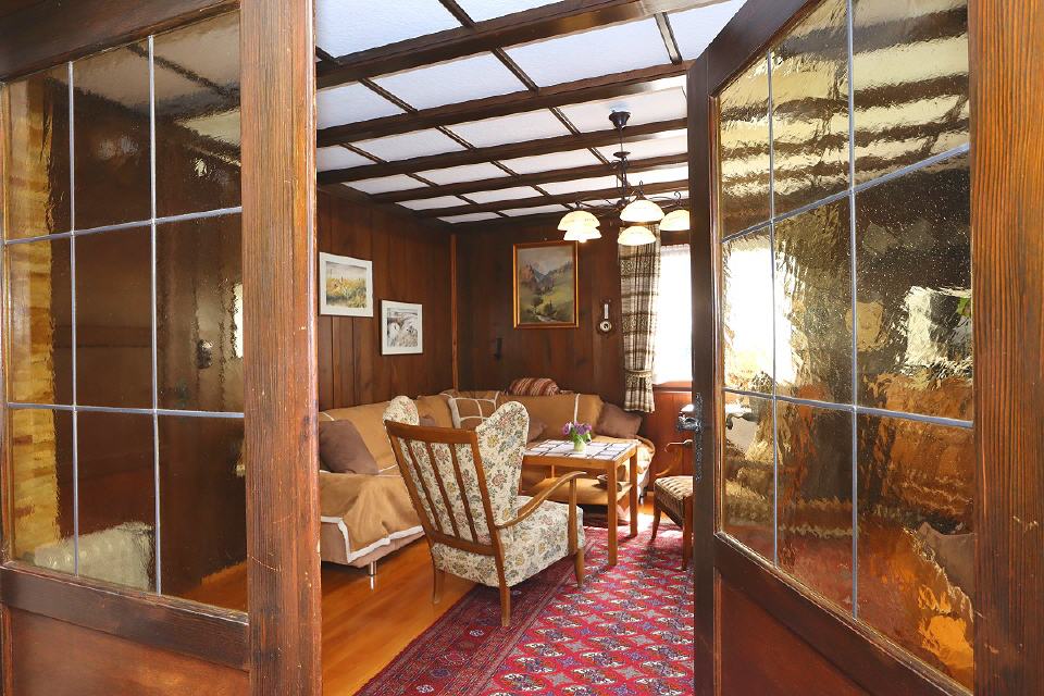 - großes Ess- / Wohnzimmer, teilbar durch Holz-Glastür in 2 separate Bereiche (Essraum, Wohnraum), gemütliche Sitzgarnitur, Schränke, Tisch mit Stühlen