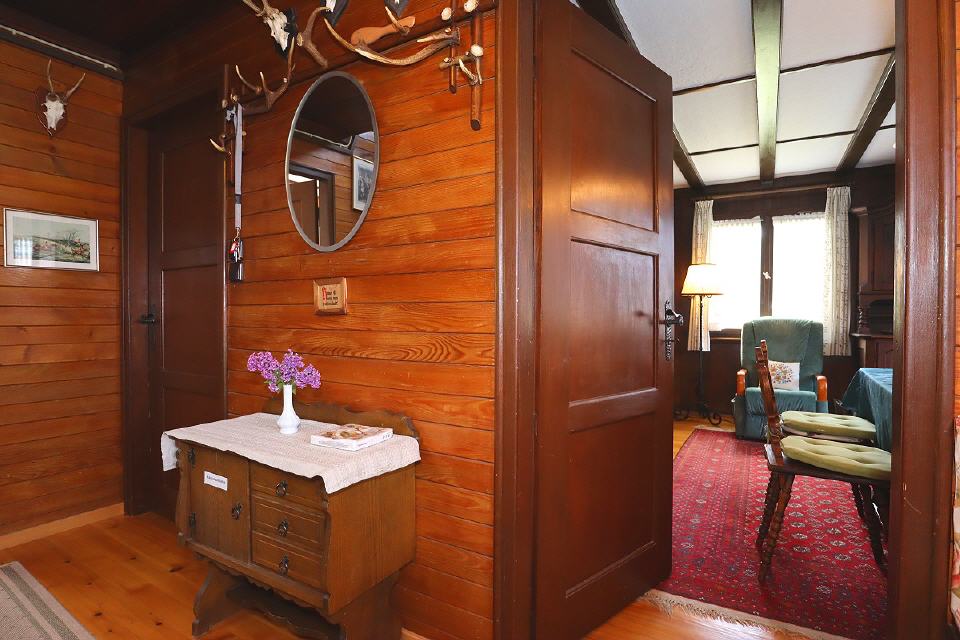 - Flur: Eingang. Kleiner Flur mit Garderobe und Sitzecke, Schuhschrank mit 2 Schubladen für Werkzeug. Über 5 breite Holzstufengelangt man durch eine Tür in den unteren Wohnbereich.