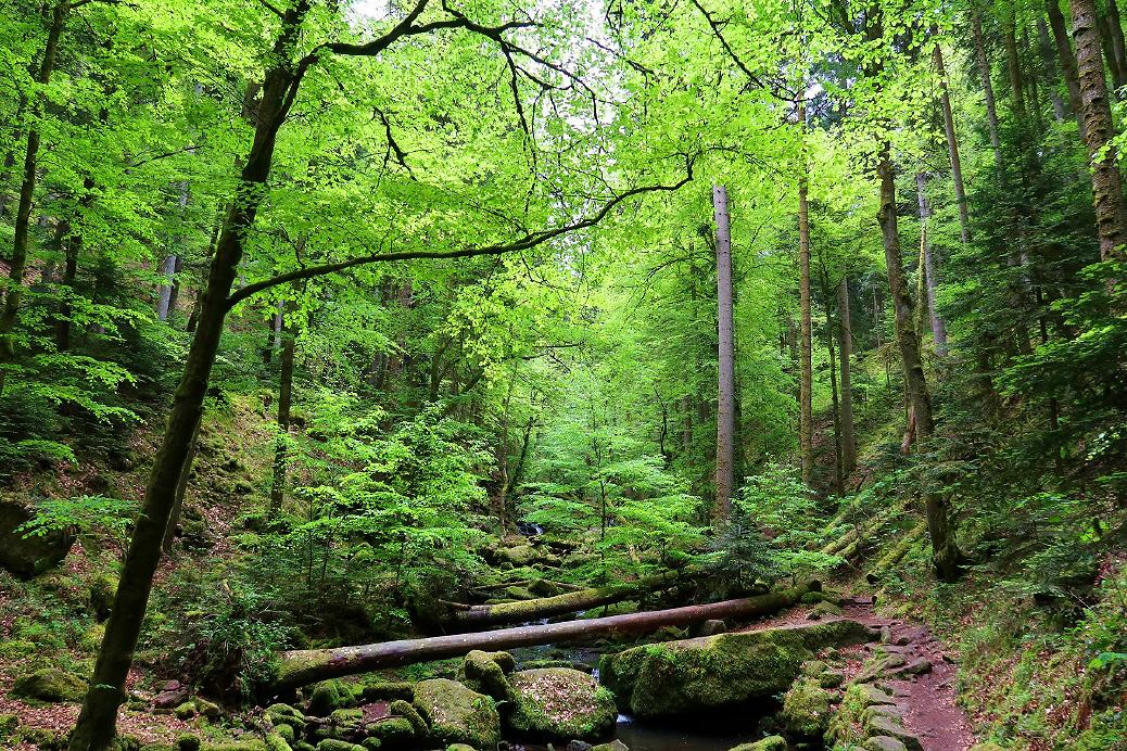 Die wilde Monbachschlucht bei Bad Liebenzell ist ein Erlebnis besonderer Art und sollte bei einem Urlaub im Nordschwarzwald nicht fehlen. Der Weg führt über schmale Pfade, umgestürzte Baumstämme, vorbei an sattgrünen Flussauen, glitzernden Bächen, wilden Felsformationen und einem echten Wasserfall. Den Monbach quert man über moosbewachsene Felsbrocken. Wer an manchen Stellen nicht aufpasst, läuft Gefahr nasse Füße zu bekommen.