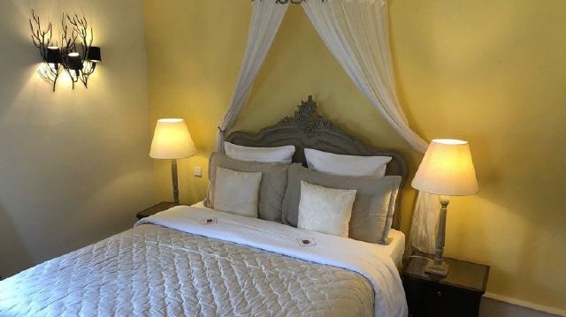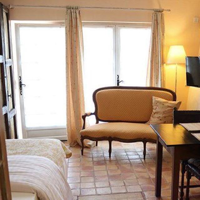 - La Frégate. Das in Sonnengelb und Erd-Farbtönen gehaltene ca. 27 qm große Zimmer mit Doppelbett im französischen Stil befindet sich im Erdgeschoss des Nebenhauses. Das helle Badezimmer mit original schwarz-gelben Fliesen und ebenerdig-begehbarer Dusche und separatem WC besticht durch seine Großzügigkeit.