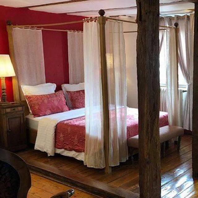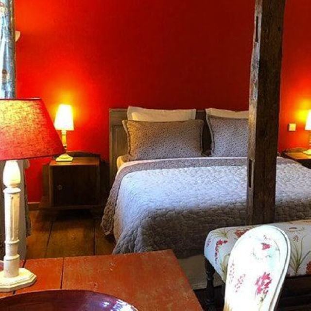- La Jonque. Dieses Doppelzimmer mit Blick in den Garten befindet sich im ersten Stock. Es erinnert in seinen Elementen an eine fernöstliche Dschunke mit viel Holz und Rot als vorherrschende Farbgebung und einem Doppelbett in französischem Stil sowie einem Biedermeier-Sofa und einem kleinen Schreibtisch. Das separate Badezimmer erreicht man über einen kleinen „Niedergang“. Es verfügt über eine Kupfer-Badewanne, einen historischen Waschtisch mit Marmorplatte und WC.