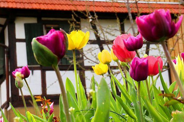 Gepflegte Fachwerkhäuser mit geraniengeschmückten Gesimsen und Balkonen, zahlreiche alte bepflanzte Brunnen und Tröge und üppig blühende Vorgärten ergänzen das idyllische Bild der Landschaft.