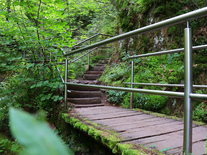 Vom Rabenfelsen aus führt der Wanderweg zunächst an einem Streuobstfeld mit Kirschbäumen entlang, zum Denkmal des 110. Badischen Reserve-Infanterieregiments und nach wenigen Metern zum Wanderparkplatz „Blöchereck“. Hier folgen wir der Gemeindestraße „Gottschläg“, bis die Wegmarkierung darauf hinweist, die Straße zu verlassen. Dort beim so genannten „Richard-Bernhard-Blick“ oder auch „Sattel“ genannt, führt der Wanderweg in einigen Serpentinen einen schmalen Waldpfad hinab und wir gelangen zum nächsten Wegweiserstandort „Gottschlägtal“. Jetzt befinden wir uns oberhalb der sagenumwobenen Edelfrauengrab-Wasserfälle.