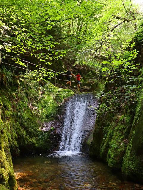 Wir halten uns aber in Richtung Edelfrauengrab, kommen nach wenigen Minuten zum „Romantischen Brückle“ und befinden uns beim so genannten „Degler-Bad“ schon im Bereich der oberen Wasserfälle. Der Gottschlägbach bildet in diesem Abschnitt mehrere bis zu acht Meter hohe Wasserfälle und überwindet auf kurzer Strecke einen Höhenunterschied von mehr als 100 Metern. Innerhalb der Wasserfälle bietet sich ein kurzer Abstecher zum eigentlichen Edelfrauengrab an, wo auf einer Hinweistafel die Sage um den Ritter von Bosenstein und seiner Ehefrau geschildert wird.