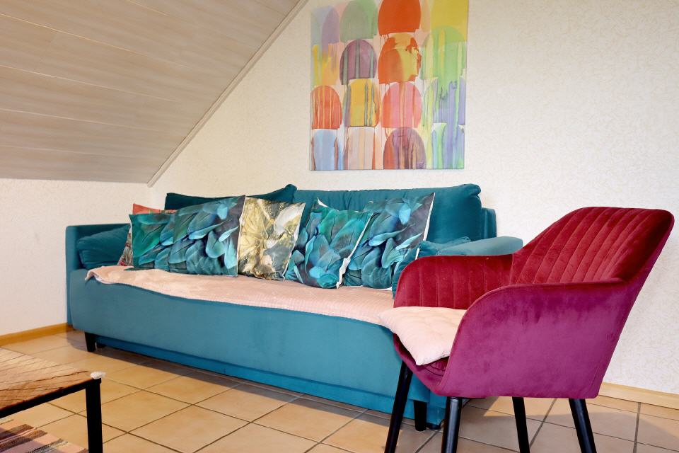 - Wohnbereich: Schlafsofa, Esstisch, TV Sat / Kabel