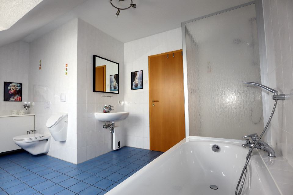 - Sanitär: Föhn, Badewanne, Waschbecken, Dusche, Badetücher, Spiegel, WC, Handtücher