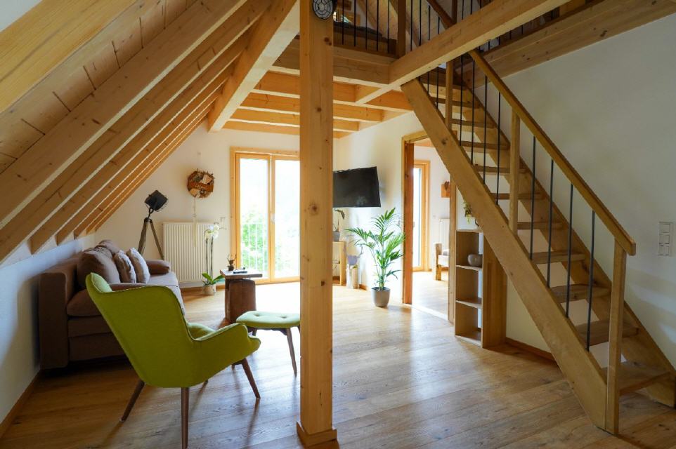 Die offene Bauweise sorgt für schöne, helle und warme Räumlichkeiten, sichtbares Dach.