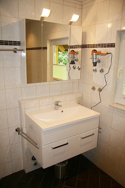 1 Badezimmer mit Dusche, Waschbecken und WC