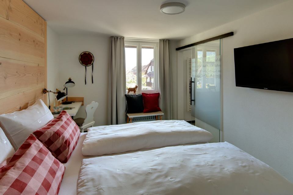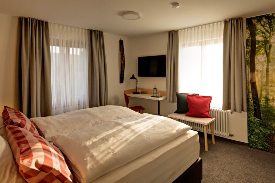 Unsere Schwarzwald-Erlebniszimmer vermitteln das spontane Gefühl von Bleibenwollen. Ganz natürlich gestaltet mit Heimischen Hölzern.die auf liebevolle Details treffen. Tradition – behutsam, leicht und gradlinig interpretiert. Der Teppich im Flur ist von der gleichen Farbe wie die Waldwege, auf denen Sie soeben gewandert sind. Der grüne Fußbodenbelag in Ihrem Zimmer erinnert Sie an das Moos, das Sie noch vor Minuten unter den Füßen gespürt haben. Und er fühlt sich fast genauso an.Die Rückwand des Bettes duftet nach Nadelholz. Die Keilförmigen Bretter sehen aus, als könnten sie von einem langen Leben auf einem Schwarzwaldhof erzählen. Die natürlich gewellten Ränder und Flächen laden zum Darüberstreichen ein. Der Kalkputz der Wände unterstreicht die authentische Anmutung.Helle Möbel und Vorhänge lassen den Eindruck des Sonnenlichts in Ihrer Seele nachklingen. Die Bäder sind mit grauen Fliesen gefliest. Sie nehmen Bezug auf die Steine des Waldes. Die Waschtischuntergestelle sind aus Schwarzstahl und sprechen für alte Handwerkskunst.Mit den farbenfrohen Handtüchern im Bad assoziieren Sie sofort die bunten Wiesenblumen, die Sie gerade sahen. Deshalb heißen sie auch „Blumenwiese“, Hahn & Henne“ oder „Tradition“. Sie lieben die Optik und Haptik der naturbelassenen Oberflächen, Sie lieben die Materialien, die Geschichten erzählen. Sie fühlen sich geborgen und spüren, was Heimat bedeutet. - Die Preise entnehmen Sie bitte unserer Homepage.