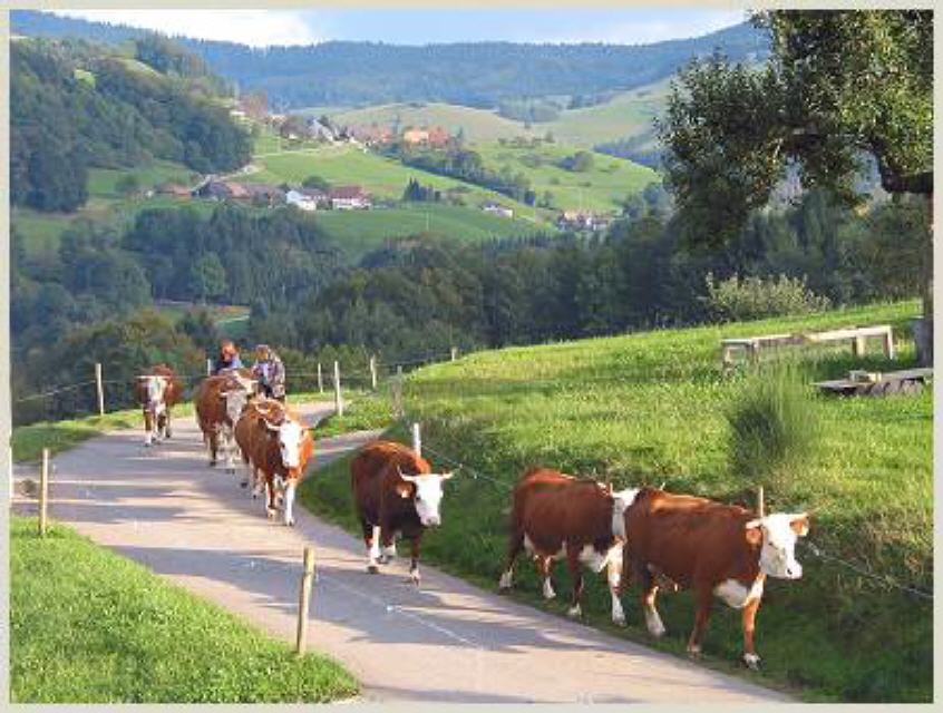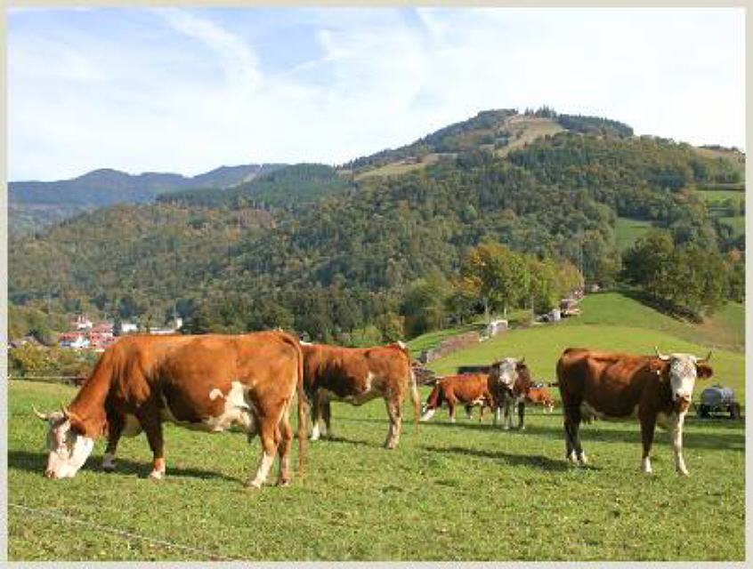 Unser Hof, den wir mit großem Engagement und viel Zeitaufwand extensiv bewirtschaften, verbindet das Neue mit bewährter bäuerlicher Tradition des Wiesentales. Als Kleinstbetrieb beschränken wir uns auf die Haltung von etwas Milchvieh und die Aufzucht von Jungvieh. Wir sind einer der Zuchtbetriebe für das “Hinterwälder Rind” im Wiesental und beteiligen uns damit aktiv an der Erhaltung dieser vom Aussterben bedrohten zierlichsten europäischen Rinderrasse. Die Äpfel unserer Streuobstwiese verarbeiten wir selbst zu Apfelsaft und Obstschnaps. “Urlaub auf dem Bauernhof” heißt bei uns, dass Sie uns, die Familie Bauer, beim Alltag auf dem Hof so erleben können, wie Tier und Natur es erfordern. Unser Kuhstall ist kein Streichelzoo, aber wer mag, darf gerne mit uns die sehr sanftmütigen Hinterwälder morgens auf die Weide treiben und abends zurückholen. Der Einsatz von Maschinen auf einem modernen Hof schränkt die Mithilfe williger Laienhände ein, bei der herbstlichen Apfelernte jedoch ist jede helfende Hand willkommen.